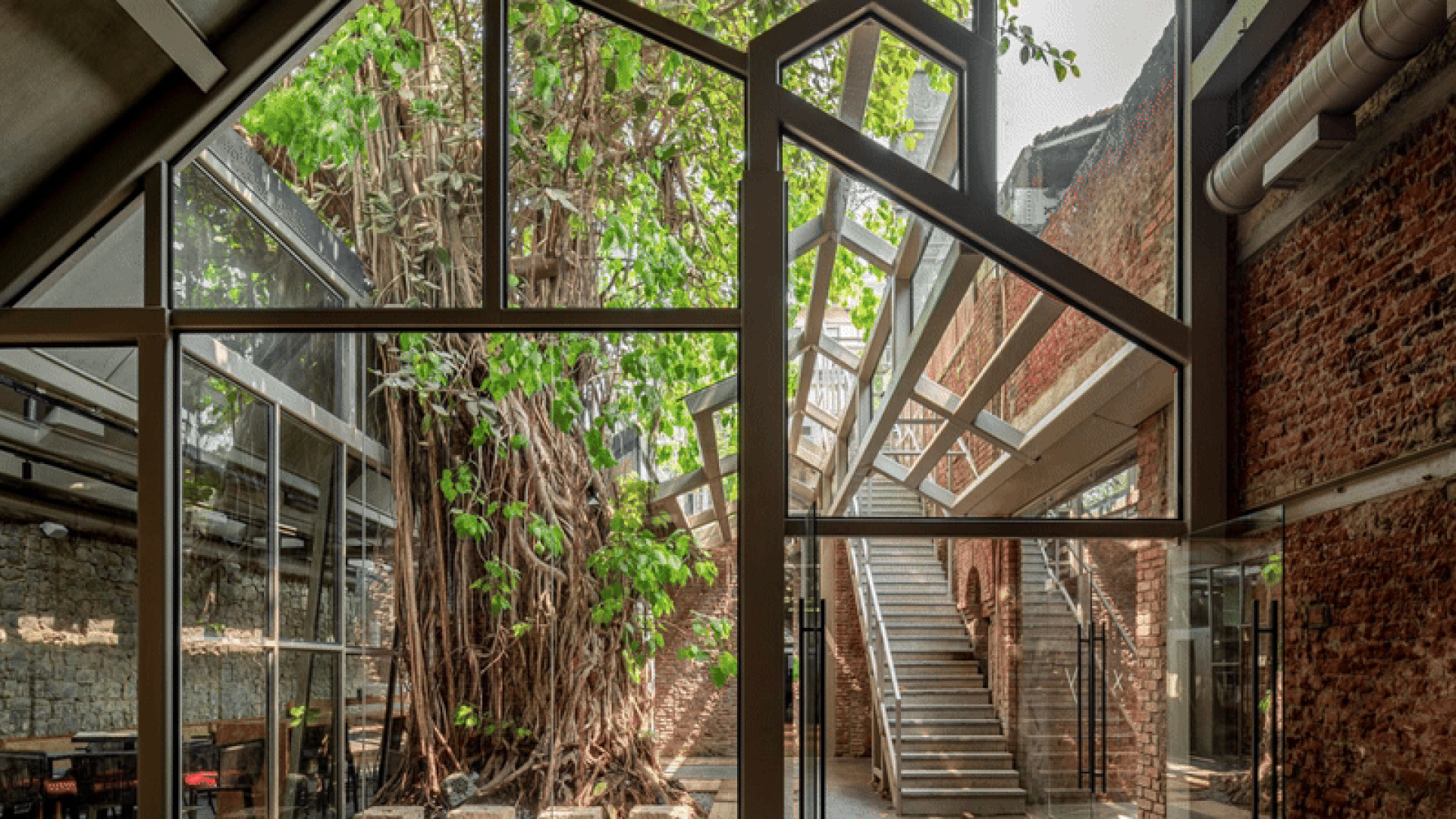 A 140-year-old former ice factory in Mumbai has been transformed into IF.BE, a 10,000 square foot experimental architecture and art venue, featuring a magnificent 150-year-old banyan tree at its center. Beneath its canopy sits Banyan Tree Café, which aims to offer a fresh experience centered on healthy eating in a bustling city. Inspired by the tree, the cafe was named Banyan Tree Cafe. The original industrial architecture has been largely preserved, maintaining a raw and visceral character.